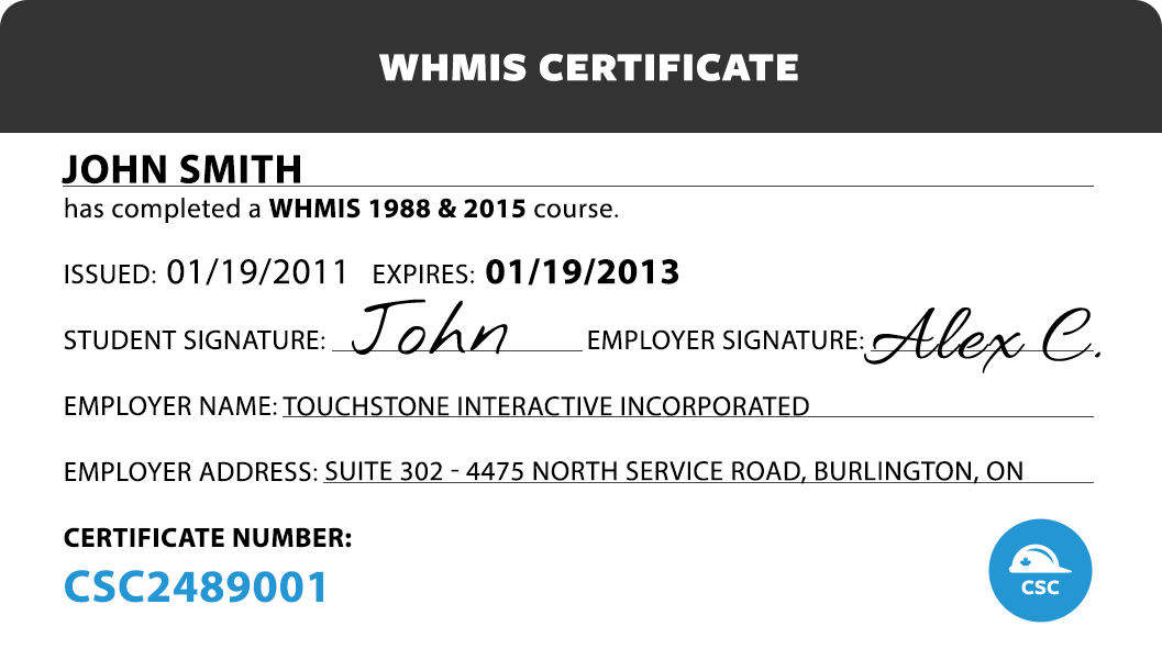 All employers are required to show diligence in ensuring their employees are WHMIS trained. WHMIS systems must be reviewed every year, including some measure of training. With this WHMIS program, training history and exam results are stored for a minimum of three years and may be accessed on demand, at any time. Upon completion of training, you should be able to answer the following questions: